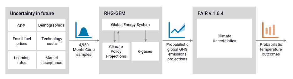 In order to develop a reliable climate outlook, Rhodium Group had to account for numerous uncertainties intrinsic to economic model inputs, such as population developments, commodity prices, and technology costs. To manage these uncertainties effectively, they employed Monte Carlo Analysis, a statistical technique that involves running a large number of simulations to capture a range of possible outcomes; all while ensuring thorough and evenly distributed input sampling of the input parameter space using Latin hypercube sampling