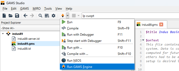 - Select “Run GAMS Engine” Remember to configure cuOpt as your LP solver, either through the command-line parameter (as demonstrated below) or by including an appropriate option statement within your GAMS code.