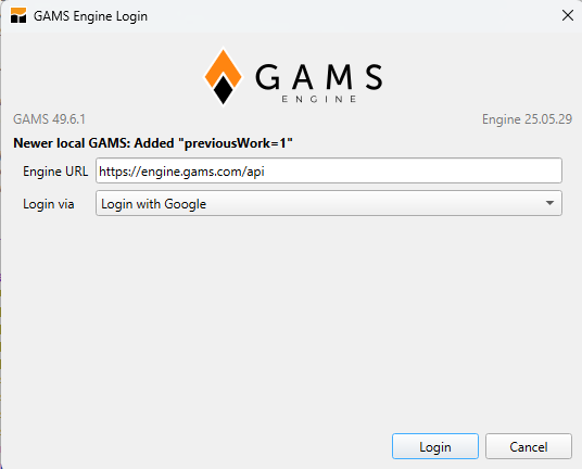 - Should you not already be logged in, the GAMS Engine Login Dialog will appear. Please choose your preferred sign-in method to proceed with logging in.