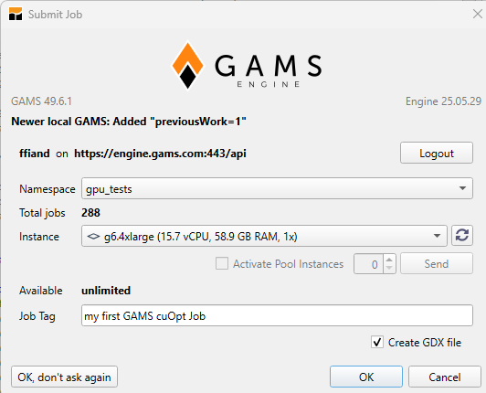 Hint: Are you a Windows or Mac user working with GAMS Studio? No Problem. While cuOpt is only available for Linux, you can submit your GAMS/cuOpt jobs from GAMS Studio under Windows and Mac as well.3