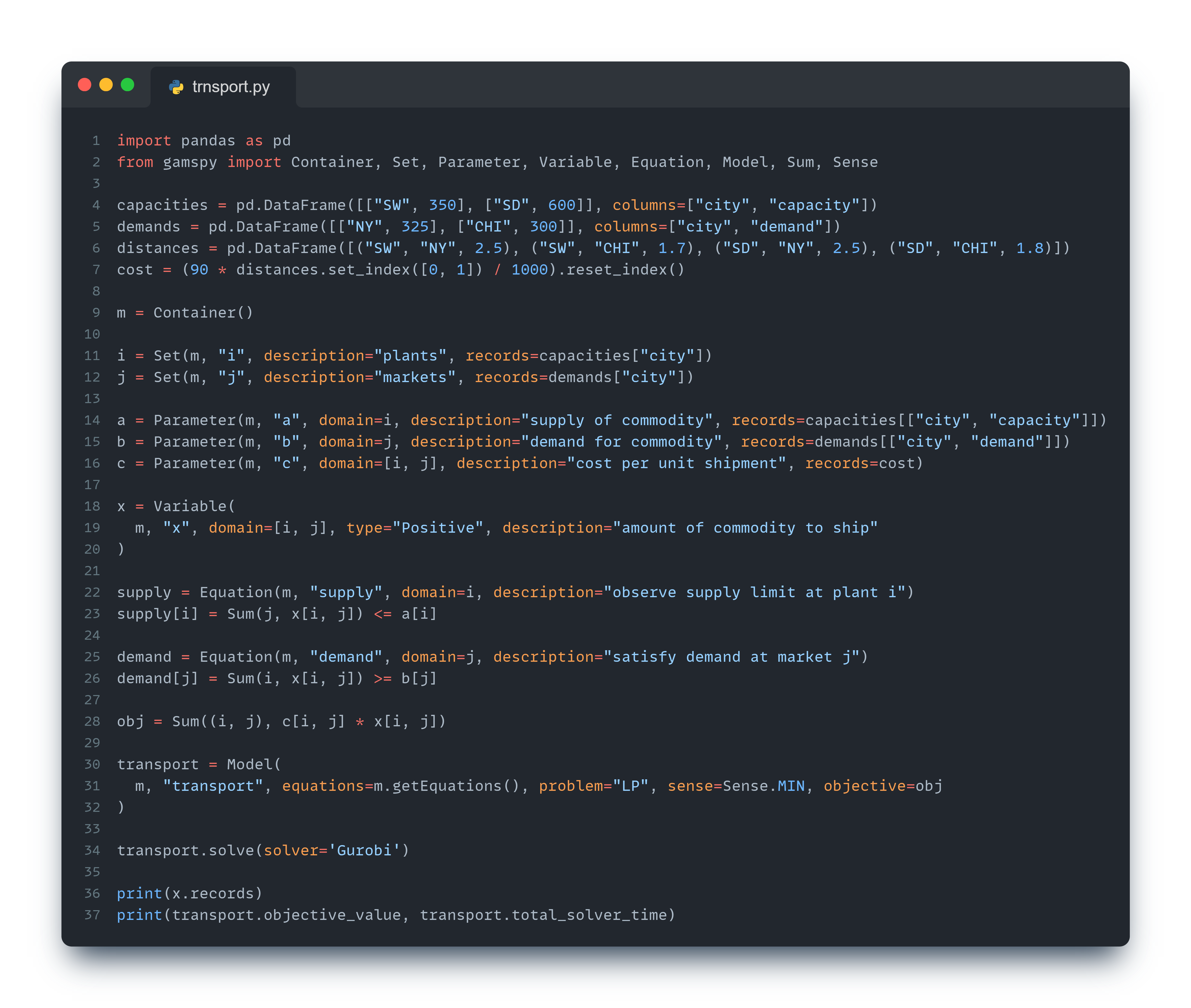 With GAMSPy we introduce a new way to streamline the complete optimization pipeline starting with data input and preprocessing followed by the implementation of the mathematical model and data postprocessing and visualization, in a single, intuitive Python environment. GAMSPy allows you to leverage your favorite Python libraries (e.g. Numpy, Pandas, Networkx) to comfortably manipulate and visualize data. And it allows to import and export data and optimization results to many data formats.