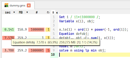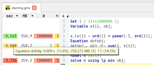 The performance has been improved when writing the Equation Listing to the output file. This improvement is particularly noticeable for equations that include a large number of identifiers. The screenshots show the speedup when comparing GAMS 51 and GAMS 52 performance in this regard using the Studio Profiler.