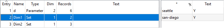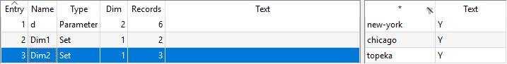 CSV2GDX creates a GDX file containing the two-dimensional set abOnlyUELs without explanatory text (needless to say, we did not specify a column to get the explanatory text from). By specifying the third column within the index option, i.e. index=1..3, the result will be a three-dimensional set (without explanatory text, too). Using the value option is not suitable, as the data type will be a parameter instead of a set (in addition, CSV2GDX expects numeric data, potentially leading to undefined values). We can read the explanatory text easily by specifying column three within the text option: