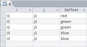 When we open the database and inspect the table created from the set ij, we see the explanatory texts stored along with the corresponding set elements. The column containing the explanatory text will be labeled with SetText automatically. The column headers can be renamed as demonstrated in Example 5 - Renaming Fields.