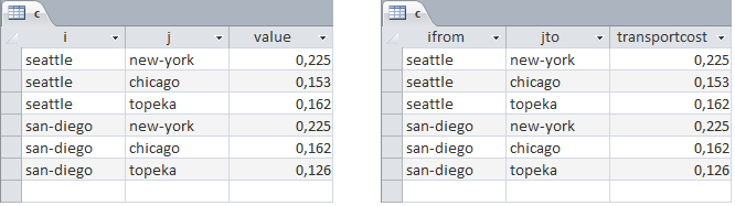 GDX2ACCES will use names like i, j, dim1, dim2, value etc. for the column headers in the resulting database file. In some cases, this may not be convenient, e.g. when more descriptive field names are required. In the following model, we will show how a small script in VBscript[1] can handle this task. The script will rename the columns i, j, and Value in table c to ifrom, jto, and transportcost. At first, the data is defined and dumped to an MicroSoft Access database. The VBscript named access.vbs is written at compile time and later executed at execution time in order to rename the column headers.