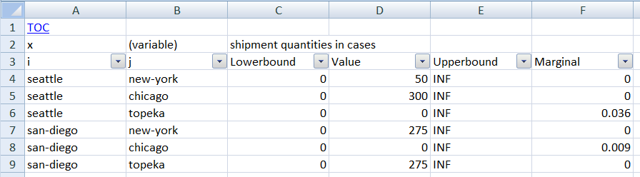 The table of contents can be reached again by clicking on the TOC link in the top left corner. The complete process shown here can be automated as is shown in section Model gdx2xls1: import trnsport.gdx. As can be seen, every identifier is stored in its own sheet. Index positions get a column with labels showing their domains, or dim1, dim2, etc. if domain information is not available. By default scalar quantities are collected in a single sheet called scalar.