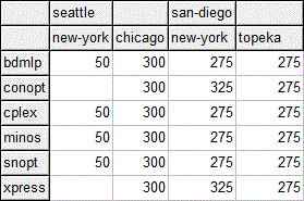 In this example, we solve the [trnsport] model from the GAMS Model Library using different LP solvers. After each run, we write all symbols to a GDX file and merge the files into one file. The variable X is read from the merged file and displayed.