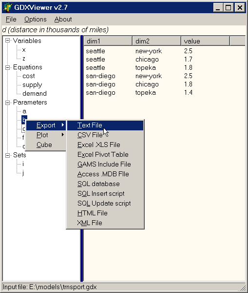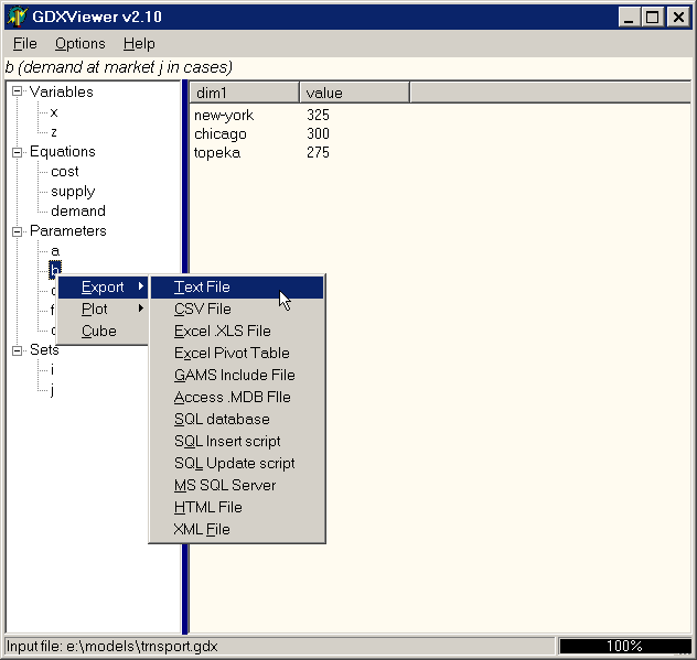 Besides inspecting a GDX file, gdxviewer allows you to export to a large number of data formats, including ASCII text, CSV, HTML, XML, database, and spreadsheet formats.