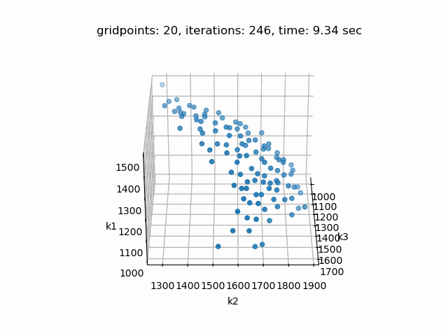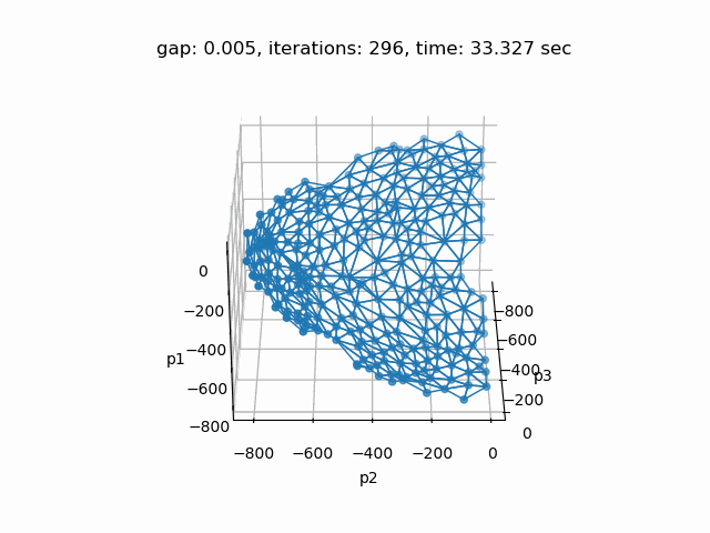Setting --p=3 with model [moo03] allows to solve the Bensolvehedron problem with three objectives. With a gap of 0.005 the Sandwiching method generates the following pareto front: