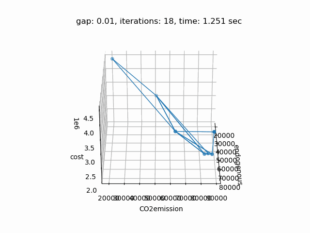Allowed model types: All model types with an objective variable, in particular LP, MIP, NLP, and MINLP. Note that the Random Weighting method may spend a lot of runs that are redundant in the sense that there can be a lot of combinations of weights that result in the same efficient point. Also note that the Random Weighting method cannot produce unsupported efficient solutions.