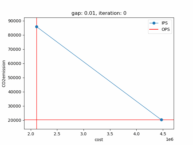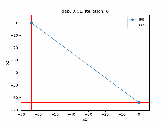 The plot shows the pareto efficient extreme points as well as the lines connecting these points (the IPS). An animation of the algorithm shows how the IPS and OPS are updated at each iteration: