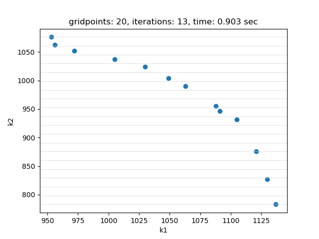 EpsConstraint: gridpoints Specify the number of grid points per objective function used as a constraint (default: 10). As an example, consider a model with three objective functions, the Augmented Epsilon Constraint method will optimize one objective function using the other two as contraints. With 10 grid points (default) the maximum number of runs will therefore be 10x10. In general, increasing the number of grid points increases the density of the approximation.