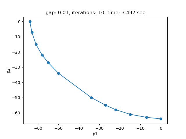 This example is also part of the GAMS Data Utilities Library, see model [moo02] for reference. The model is solved using the Sandwiching method with a gap of 0.01 (default). The objective function values of the pareto points found are saved in parameter pareto_obj: