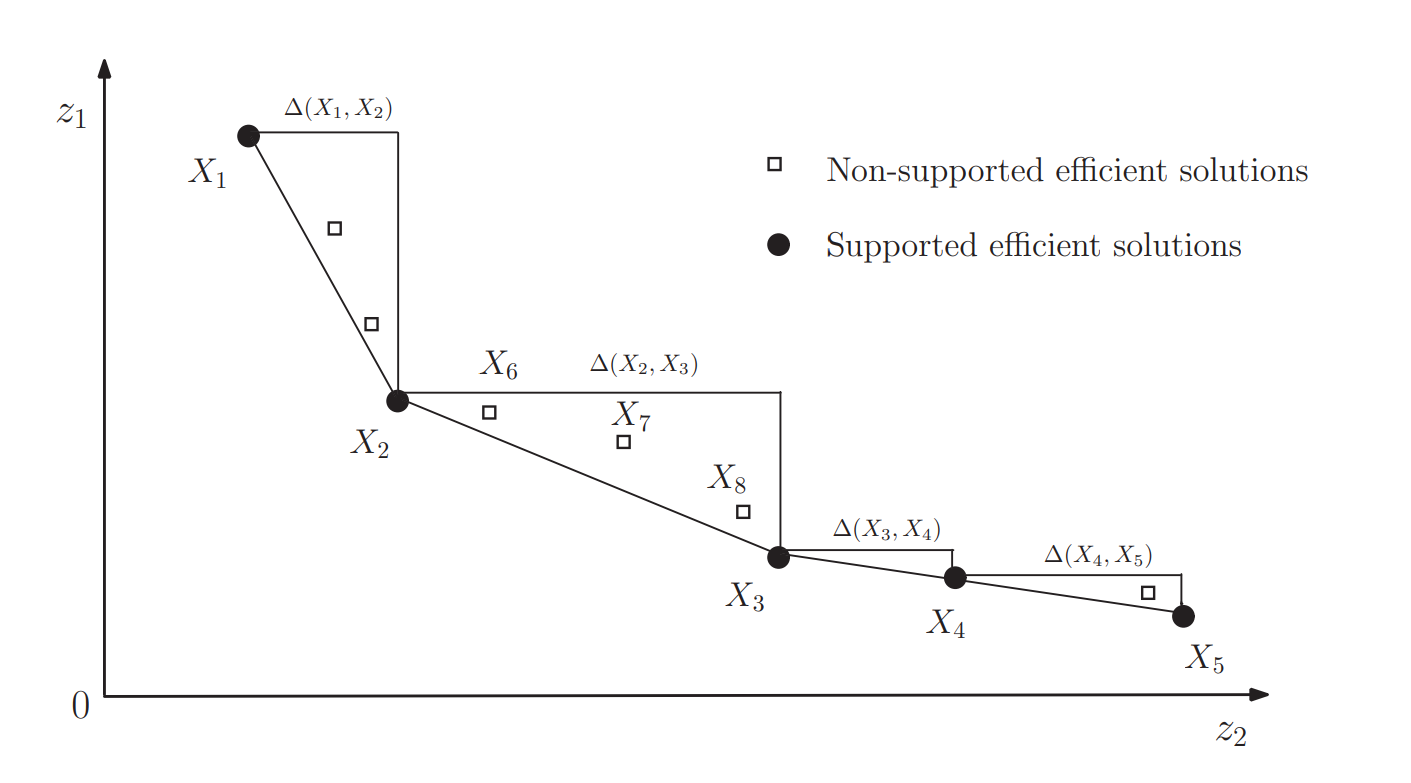 Supported and non-supported efficient solutions in the objective space Z. Graph taken from Li, Chendong & Park, Chulwoo & Pattipati, Krishna & Kleinman, David. (2011). Distributed algorithms for biobjective assignment problems. Proceedings of the IEEE Conference on Decision and Control. 5893-5898. 10.1109/CDC.2011.6161434.