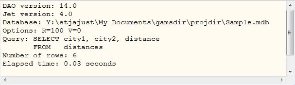 This option can be used to specify an SQL query. Queries can contain spaces and thus have to be surrounded by double quotes. For the exact syntax of the queries that is accepted by Access we refer to the documentation that comes with MS Access. The query is passed on directly to the Jet database engine, so the complete power and expressiveness of Access SQL is available. For an exact description of allowed expressions consult a text on MS Access.