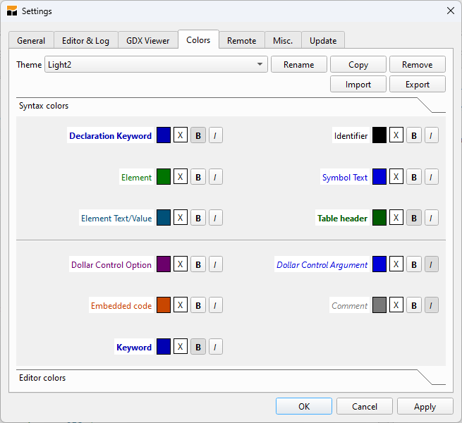 The Code Editor provides common functionality for editing, with GAMS-specific syntax highlighting. On the left side, there is a special area displaying line numbers and icons for links and errors generated by the compiler.