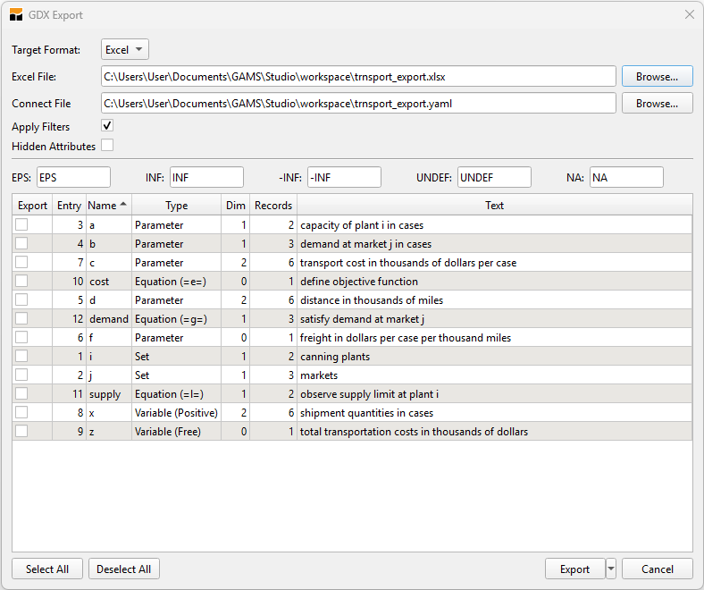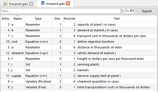 - Table: contains all editors and viewers that show table and tree elements in proportional fonts as a Central Widget, like the GDX Viewer and the Solver Option Editor. It also includes the Command Line Option Editor.