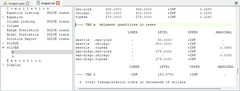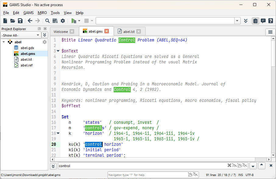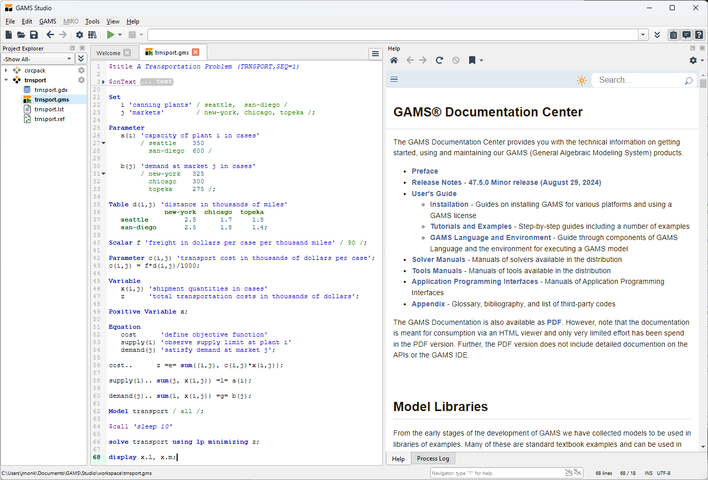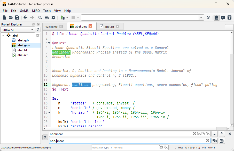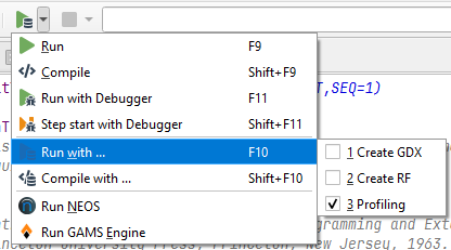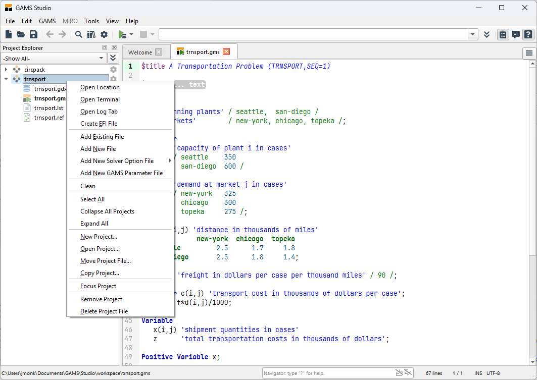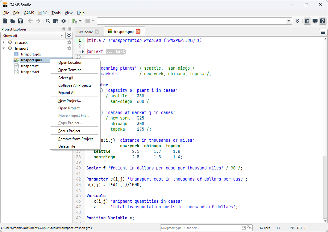 This is important to note: if you have a.gms and b.gms in a single project, and a.gms is set as the main file, pressing F9 while viewing b.gms will still run a.gms. To execute b.gms instead, you must first set it as the main file.