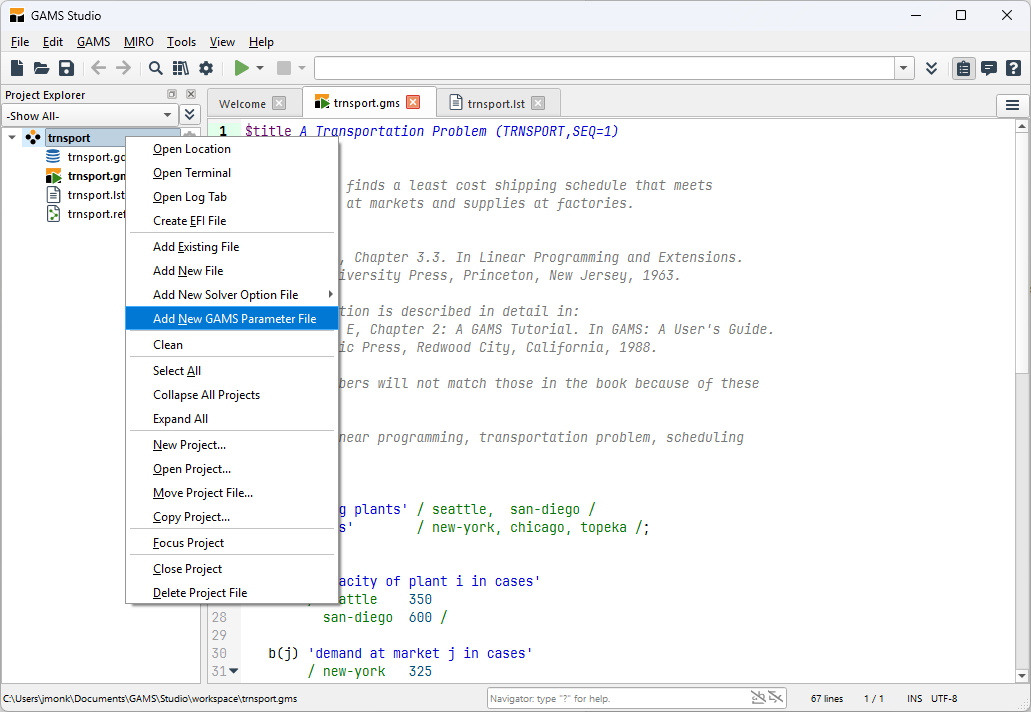 In the GAMSIDE, you always started by creating a "Project," which was essentially a pointer to the file system that defined a single working directory (i.e., it implicitly defined the workDir when starting GAMS). This directory was used to execute all the models added to the project, regardless of where the model files themselves were located. For example, if your project was in directory a, and you added models a/a.gms and b/b.gms, both files would be executed with a as the working directory. This meant all input data was expected in a (or relative to it), and all output files were also generated in a, not necessarily in the file's original location (like b).