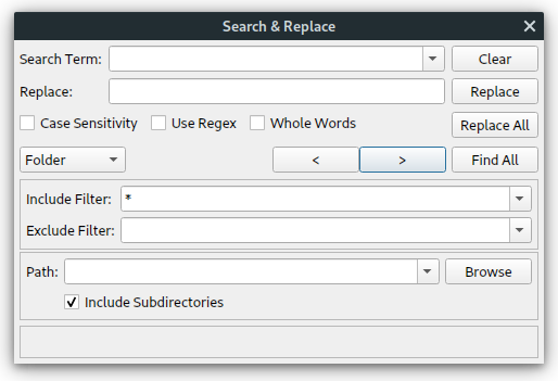 | Find | Ctrl - Shift - F | Command - Shift - F | Opens Search & Replace window, filling search field with selected text if there is any |