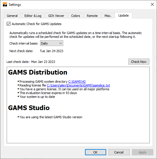 /Applications/**for a valid GAMS installation, i.e., one with the minimum required GAMS version or higher. - If needed, the path to GAMS can be set explicitly by launching GAMS Studio with the command line argument