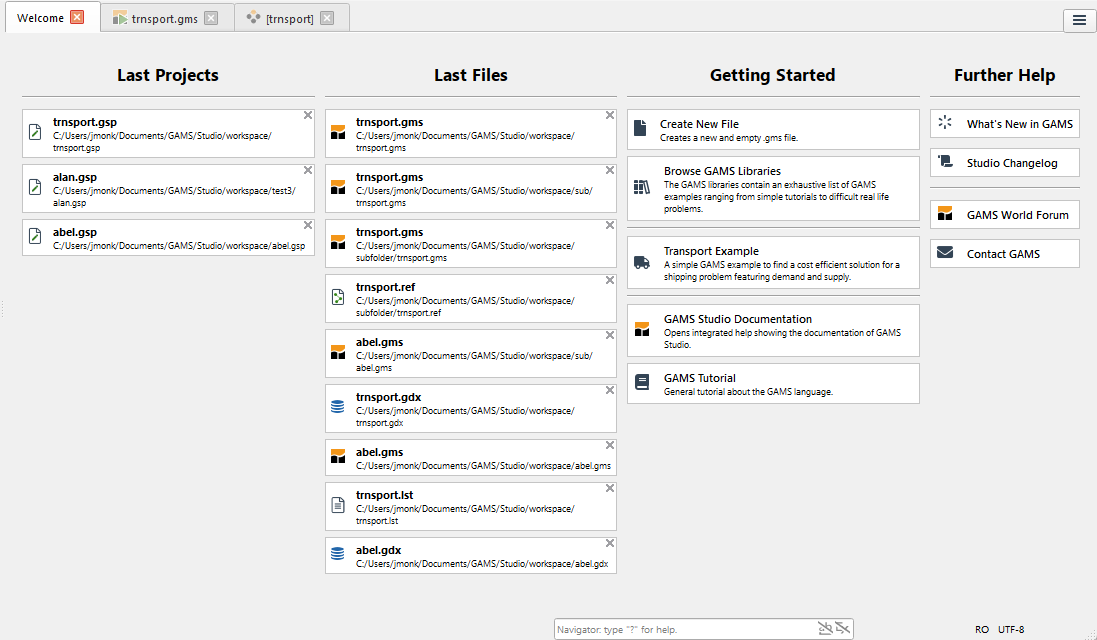 Once these settings are active, you can begin with an empty project (File -> New Project) and explicitly define the working directory, just as you would in the classic GAMSIDE.
