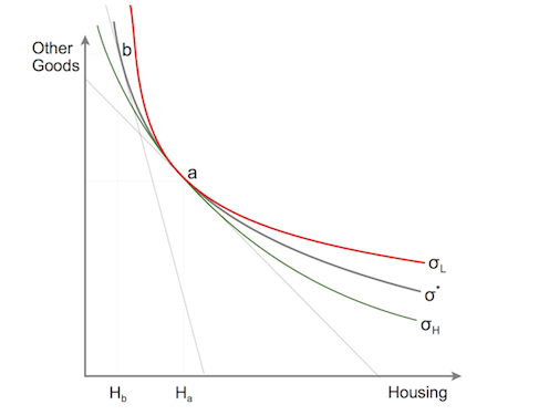 Whether Thomas derives the same welfare from the choices represented by point \(b\) like those represented by point \(a\) depends on the elasticity of substitution. The elasticity of substitution is the willingness to exchange some amount of one good for more of the other good. The three curves in the figure above represent three elasticities of substitution. Note that the less convex (flatter) the curve is, the higher is the elasticity, i.e. the more willing is Thomas to substitue housing for other goods.