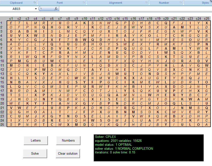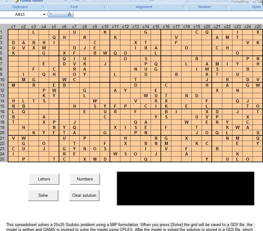 This spreadsheet is a complete example that uses GDX files to exchange information solves a 25x25 Sudoku problem using CPLEX. It comes with the GAMS distribution in apifiles/VBA/sudoku.xlsm. You will need a GAMS/CPLEX license to be able to run the spreadsheet. The MIP model solves very easily: the solution is found in the presolve phase.