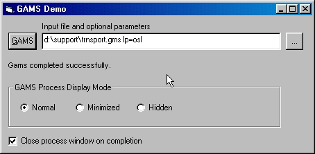 Another issue that needs to be addressed is that GAMS needs a place to put its scratch files. By default this is the current directory, a concept that is not always clear in a windowing environment. A good way of dealing with his is to set both the current drive and the current directory before running the GAMS job. It should be noted that GAMS needs write permission there. In the examples we use the Windows TEMP directory for this, but in a real application you may want to use a designated directory. The Windows TEMP directory is found by calling the API function GetTempPath.