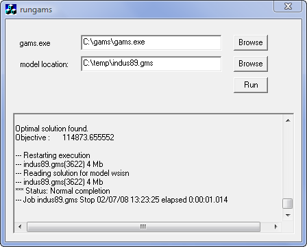As can be seen the GAMS executable gams.exe is called via a simple invocation of system(). The extra command line parameter lo=2 indicates that the log file is not written to the screen (this is the default) but to a file model.log.