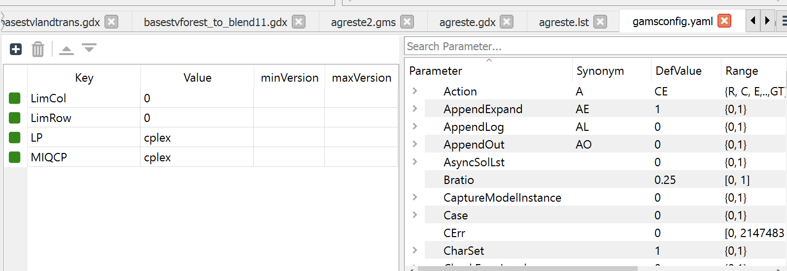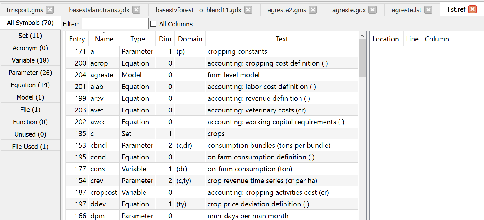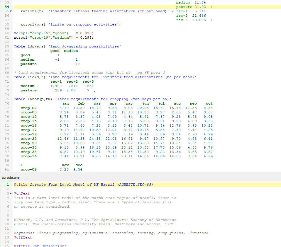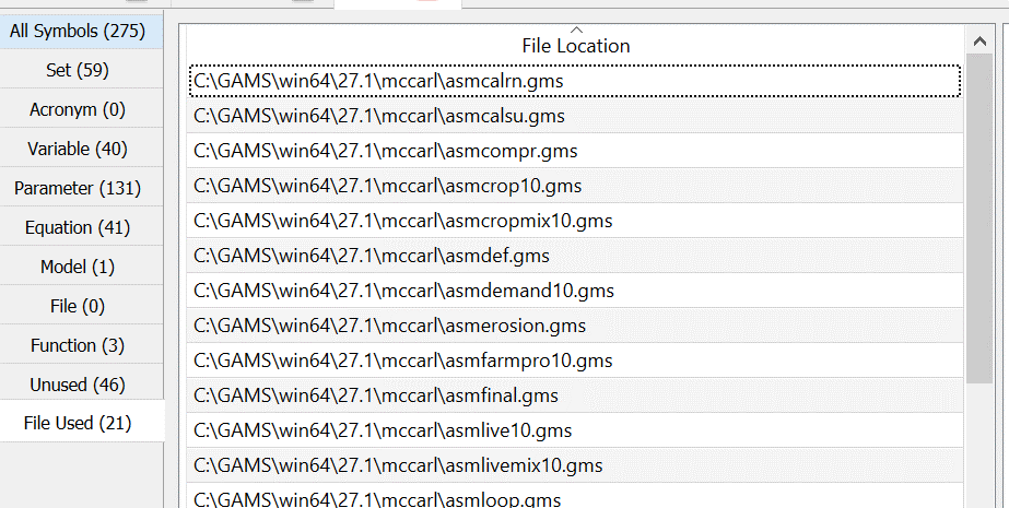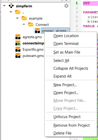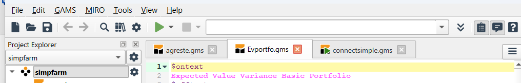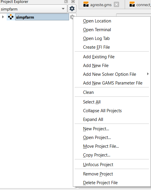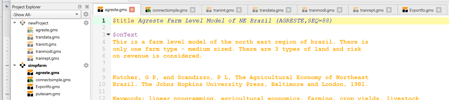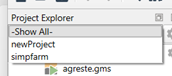 Therein the active tabs involve multiple files from each project with no real identification of what is from where. In addition the file agreste.gms is active and is present in both projects. In this case both projects use that file from a common location but this could be pointing to two identically named files in two different places. This potential overlap and file convolution can be confusing.