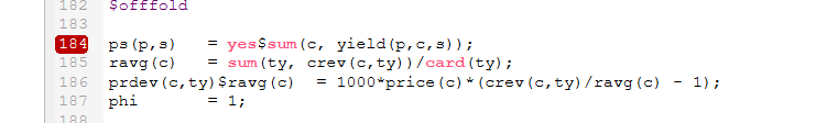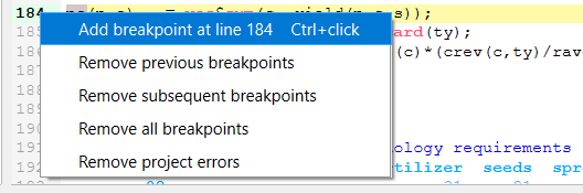 Suppose we take the model agreste.gms from the GAMS model library and assign a breakpoint at line 184. We do this by going to a line number in the code and right clicking then choosing add breakpoint as follows: