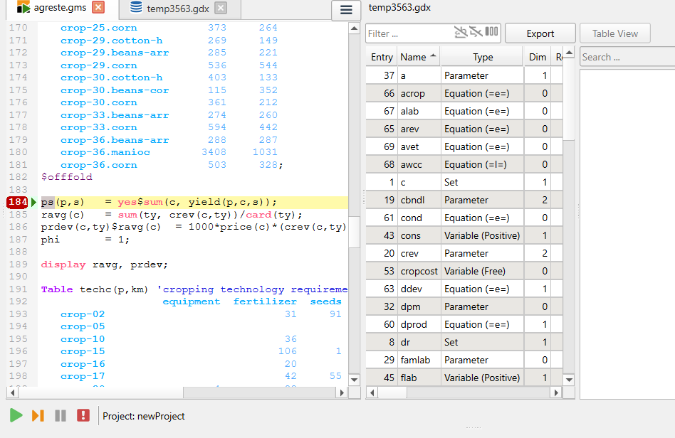 When it gets to your first breakpoint you get a screen like that below. Therein you see the breakpoint (here line 184) and a GDX file that contains values for all data in GAMS as resident in the program just before the breakpoint statement is executed. You then can explore those data using the GDX file editor features of Studio.