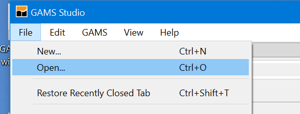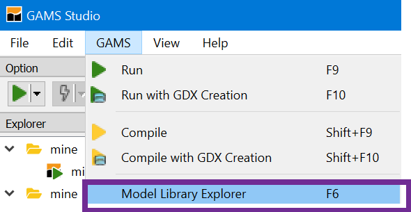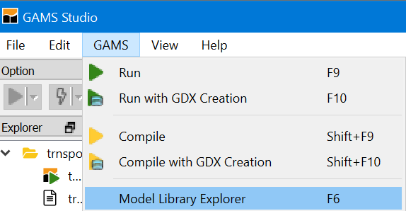 3. Open the GAMS model library explorer under the GAMS tab or press F6 (this is the simplest for first time users and the one we will use)