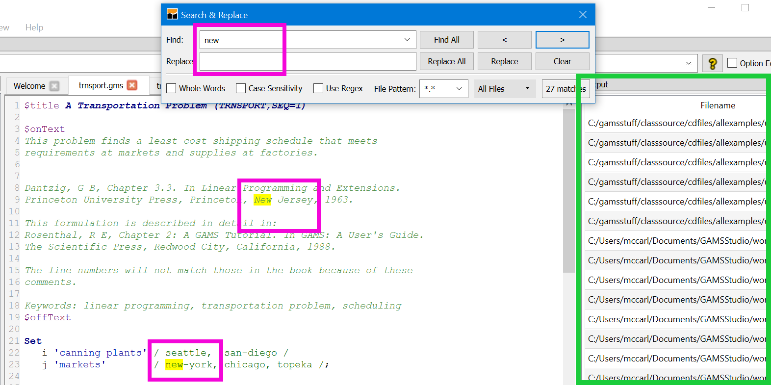 This tutorial on using GAMS Studio was written initially by and is distributed by courtesy of Bruce A. McCarl 1). Bruce has extensive experience with GAMS, both as a modeler and an educator, and many GAMS users know, use, and benefit from his work. This tutorial presents a guided tour to the usage of GAMS Studio and on some items it reflects Bruce's personal view and preferences.