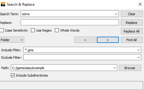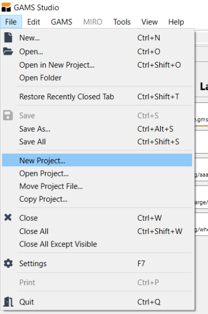 What is a project? GAMS STUDIO employs a "Project" file for two purposes. First, the project location determines where all saved files are placed (to place files elsewhere use the save as dialogue) and where GAMS looks for files when executing. Second the project saves file names and program options associated with the effort. I recommend that you define a new project every time you wish to change the file storage directory.