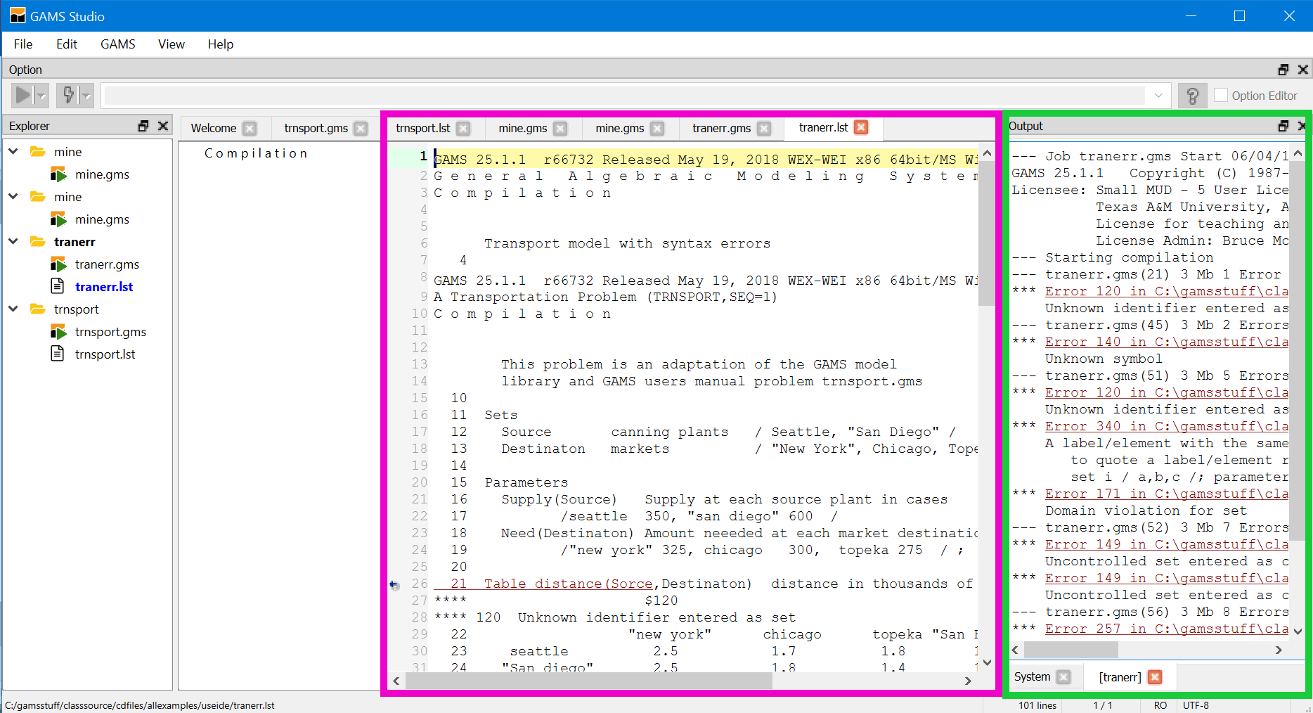 After double-clicking on any non-red line, or if we used the automatically open LST file option our main editing window is augmented by the LST file (green) (see the magenta tabs)