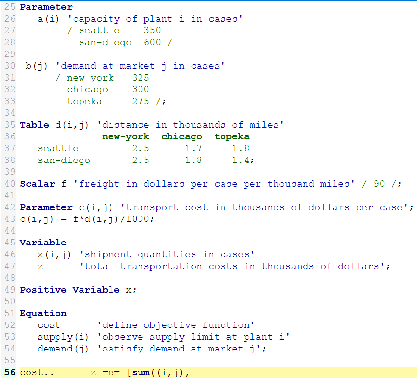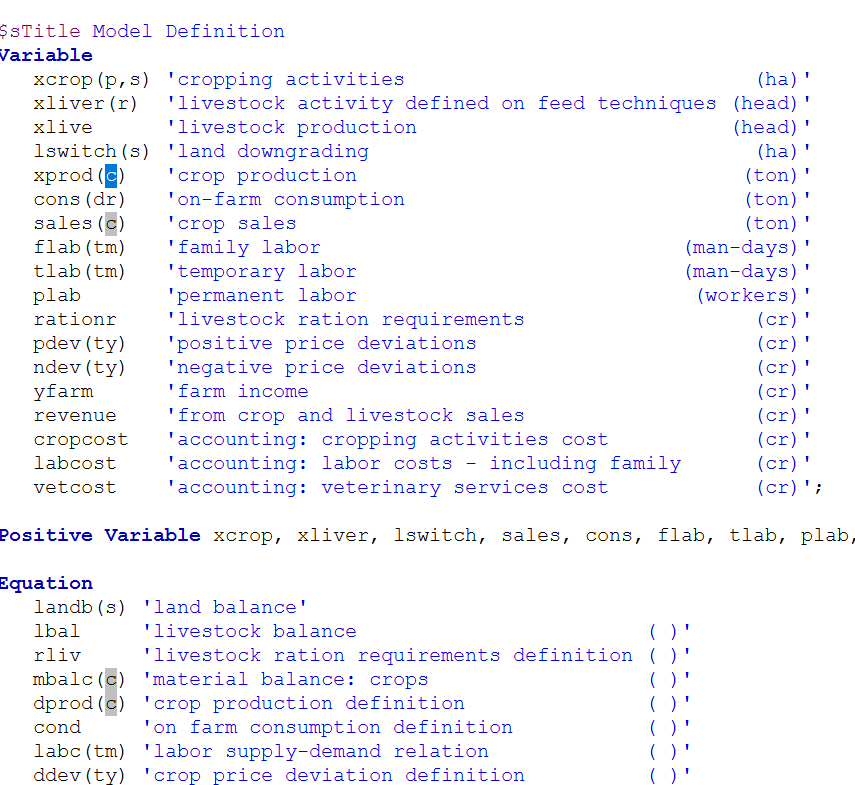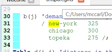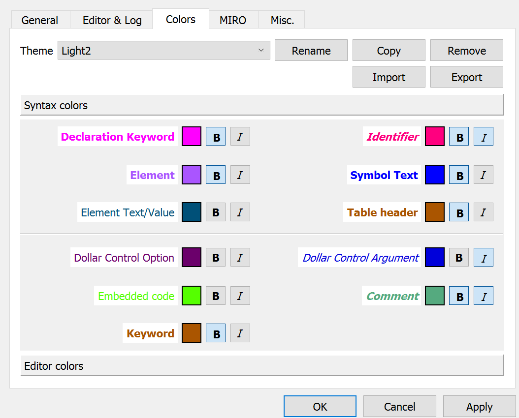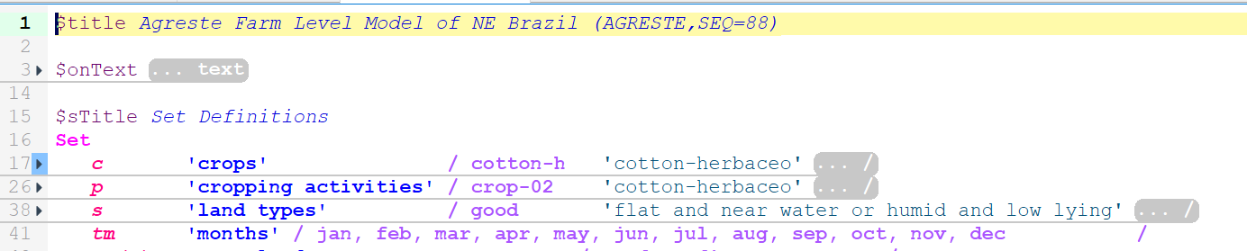 In turn you can manipulate the text coloring, bolding and italicizing in STUDIO for GAMS declaration keywords (set, parameter, Variables etc.), other keywords (set, solve etc), elements in sets, and other things.