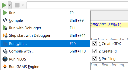 Then to run and get the GDX file one initiates a run with the Run with Debugger or F11 choice: