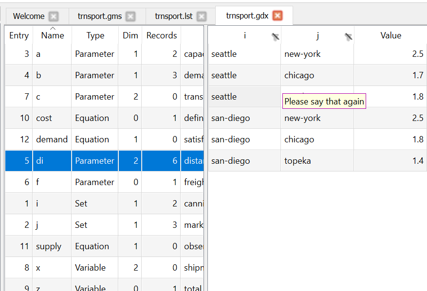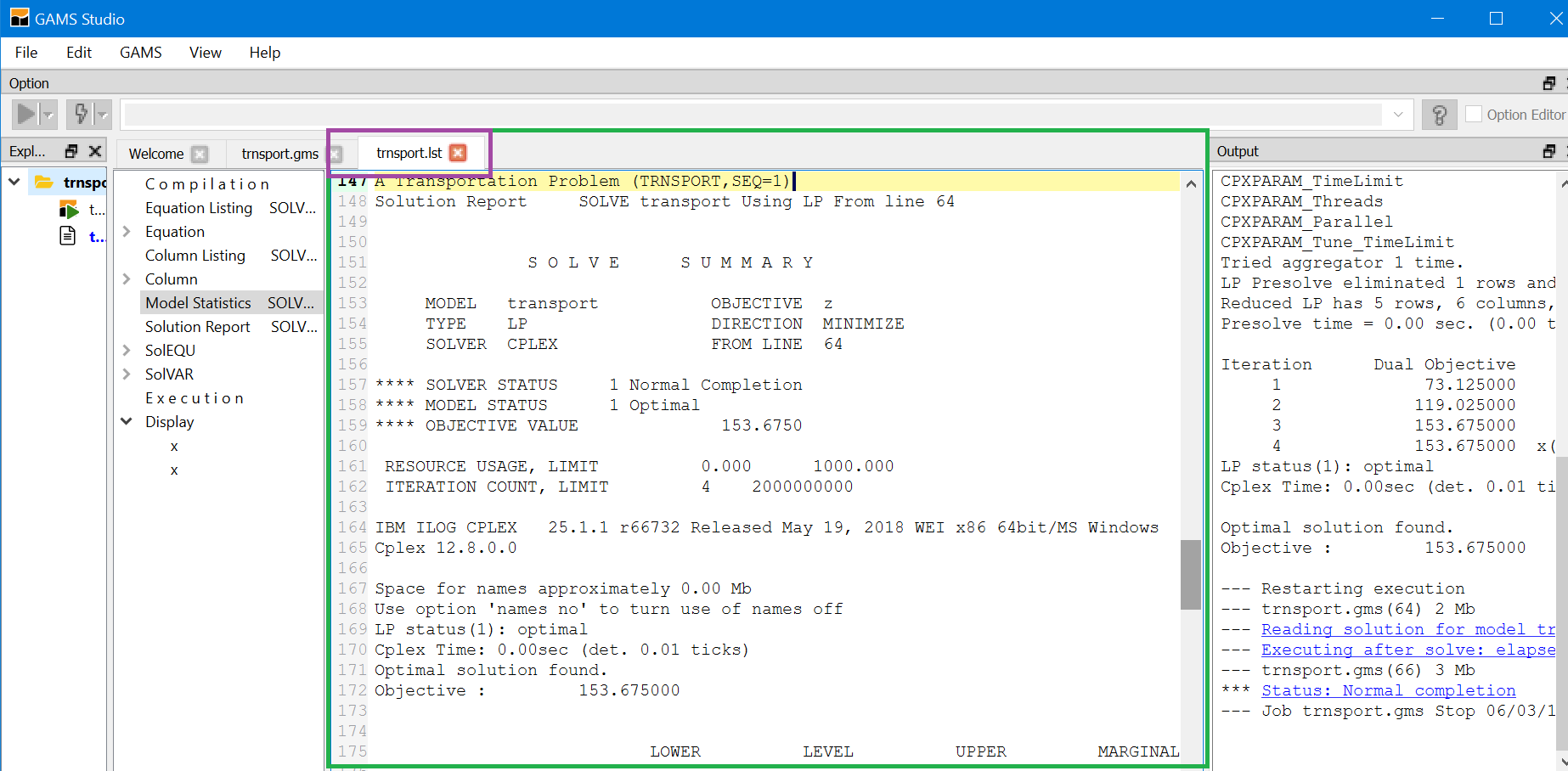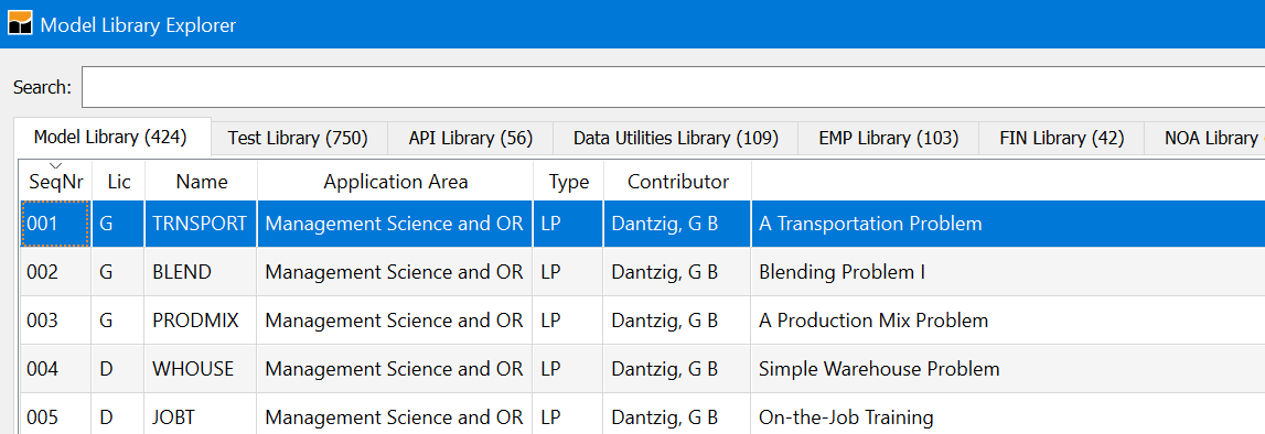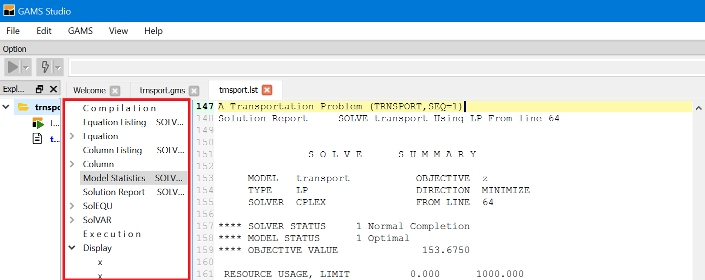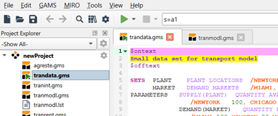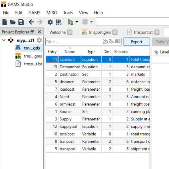When using model library trnsport.gms should now appear as part of your STUDIO screen.