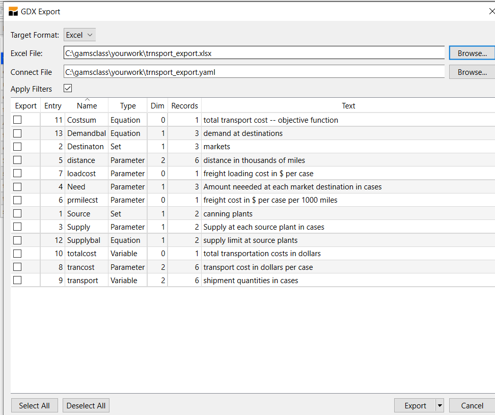 Select a model like trnsport.gms