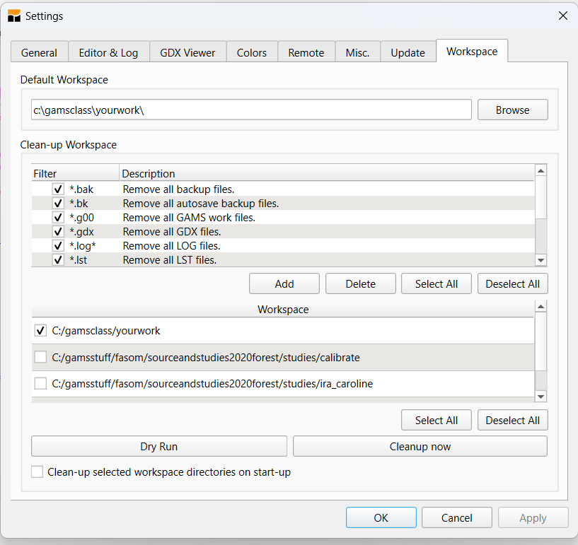 First under the GAMS menu of Studio click on the Clean All Workspaces line and the following dialogue will show up.
