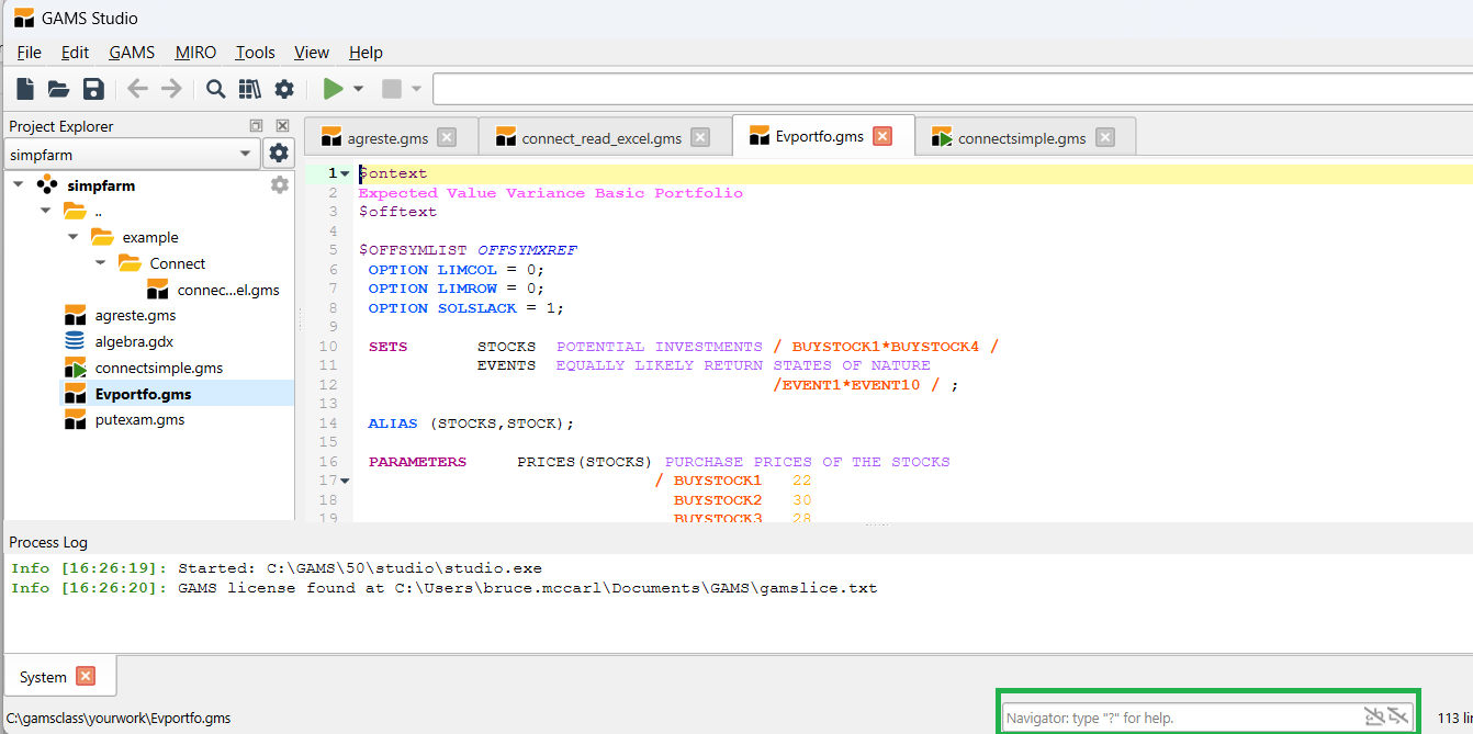The Process Log window (green) will then appear which logs the steps executed in running the model. The LST file (red) and the navigation window (magenta) also appear. Note to save space I would close the Explorer window and drag the Process Log window (green) to the bottom or the right hand side. The process window on the bottom is illustrated here and it is on the right side on the following picture.