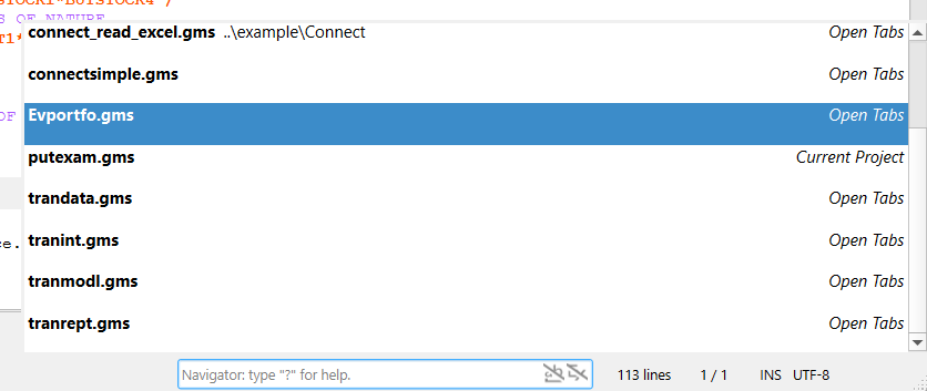 When that is done one gets a drop down menu of all files in open projects with the name of the subdirectory where they are stored in brackets plus a bolded line for the most recently opened or edited file.