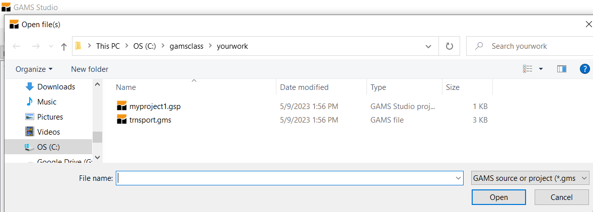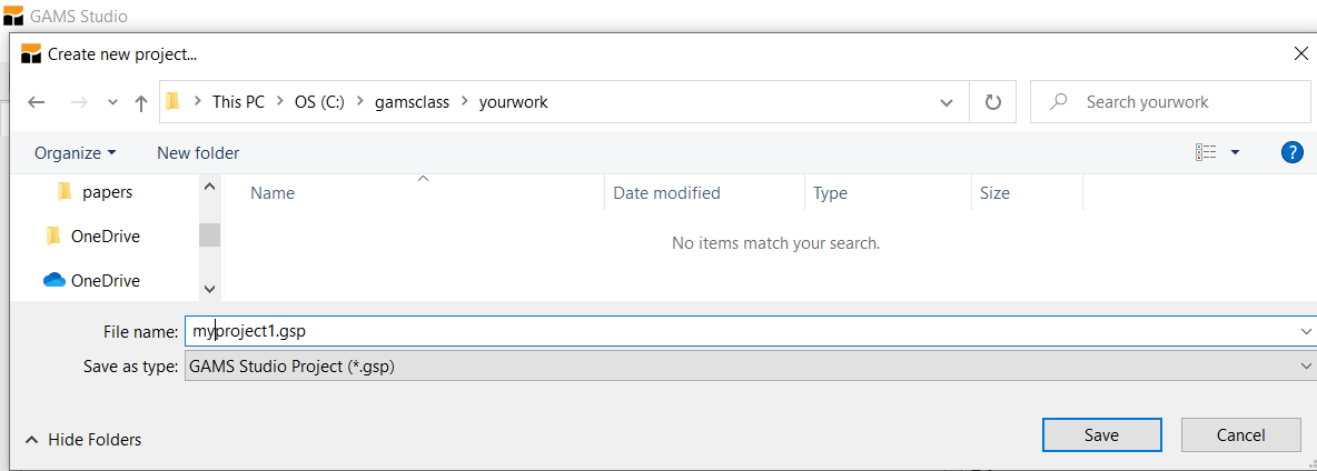 In the "File name" area type in a name for the project file you wish to use. This defines the directory where for the most part the files you wish to access (those specified without full file path names) are located. If I was doing this, I might go to a suitable subdirectory and create a subdirectory called yourwork and put in the name myproject1. In turn, your project name will be called myproject1.gsp where gsp stands for GAMS STUDIO project. Often I will call this a name related to the model like refinery or farmmodel.