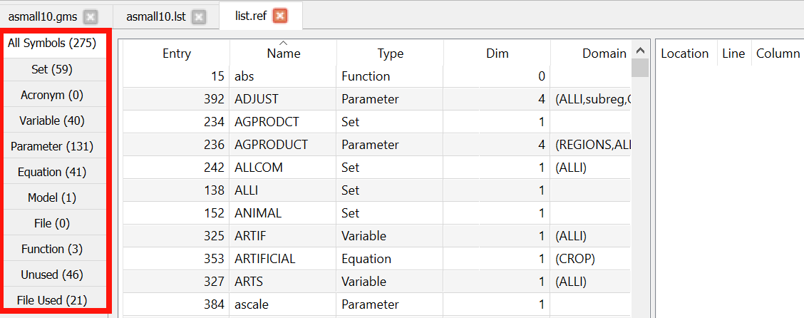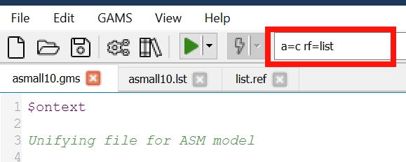 • It is often useful to just generate the reference file without any execution on behalf of the GAMS program. This is done by including the a=c option on the command line or in the command parameter box.