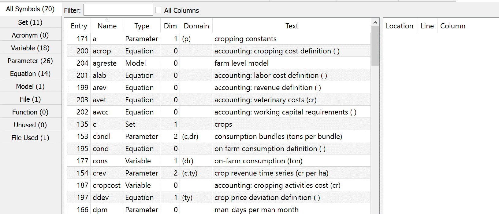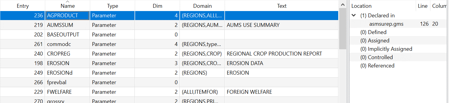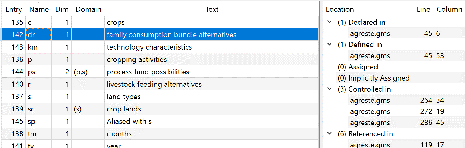 Declared places where the named item is declared in a Set, Parameter, Table, Scalar, Variable, Equation, Acronym, File or Model command. This will be the first appearance.