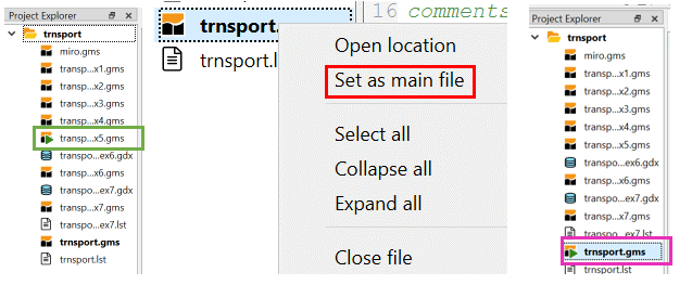 Below the first screenshot shows step 1 where the data compilation step (trandata.gms) is marked as the main file. The next shot shows when the model definition step is the main file (tranmodel.gms). Note in those two cases that the save restart information in the parameter box differs.