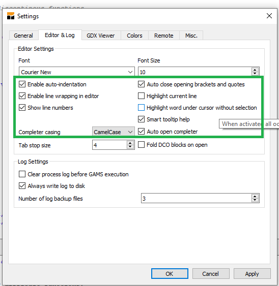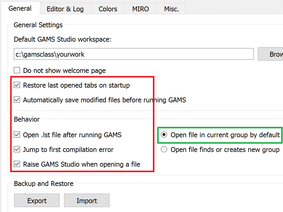 There you can change font size (under editor), tabs, default file location (called workspace) and some other features on how GAMS runs. For now leave it alone.