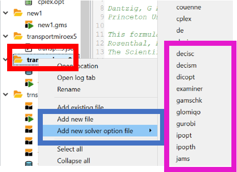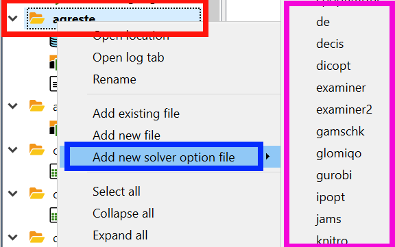 • Right-clicking on a group file name (red) in the Studio Explorer then selecting add new solver option file (blue) and subsequently selecting one of the many available solver names (magenta and only a few shown). This will create a file you then need to save.